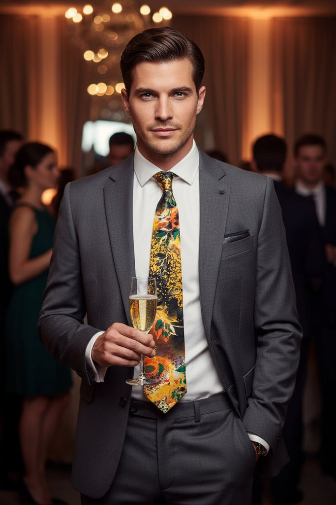 A striking floral tie that transforms any formal ensemble with botanical elegance. This piece features a vibrant tapestry of blooms set against a sophisticated black canvas, showcasing nature's diversity through varied flower species and rich color palettes. The versatile design pairs seamlessly with black suits, grey tailoring, or colored dress shirts, making it an excellent choice for executive presentations, leadership conferences, and high-stakes professional gatherings. The intricate floral composition commands attention while maintaining the refined aesthetic expected in boardroom settings, ensuring you project both confidence and refined taste.