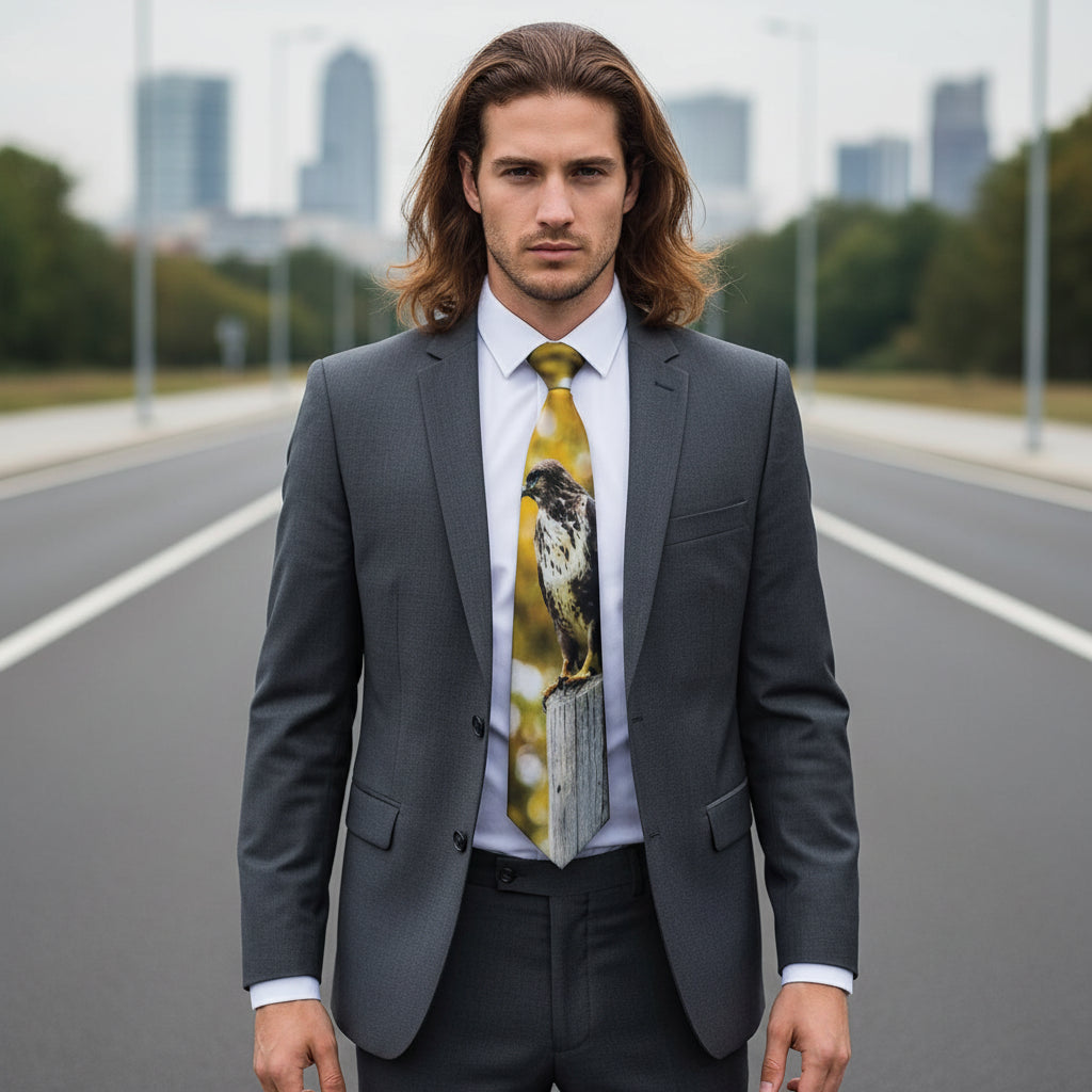 This sophisticated necktie showcases an expertly rendered eagle motif positioned on a rustic wooden perch, delivering a compelling visual statement for the modern executive. The composition balances nature-inspired artistry with polished refinement, positioning it as an exceptional selection for professionals who prioritize distinctive presentation without compromising on understated elegance. Perfect for those seeking to infuse their formal attire with personality and cultural depth.