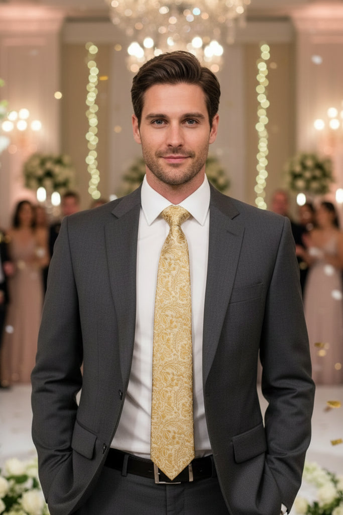 Elevate your wedding ensemble with this sophisticated silk golden tie, meticulously crafted for the discerning groom or groomsman. Woven from premium silk fabric, this tie delivers a lustrous sheen that captures light beautifully, making it an ideal choice for formal ceremonies and celebrations. The rich golden hue complements traditional and contemporary wedding attire alike, offering versatility across various color palettes. The smooth silk construction ensures comfortable wear throughout your special day, while its refined appearance adds an understated elegance to your look. Perfect for creating a cohesive wedding party aesthetic or standing out with timeless sophistication.
